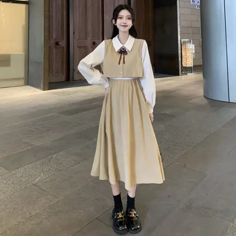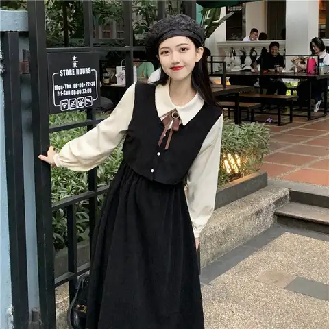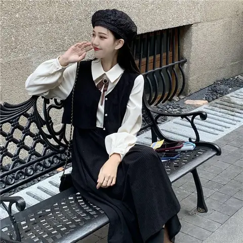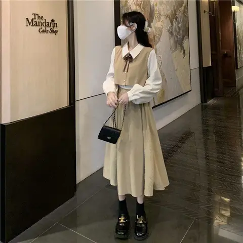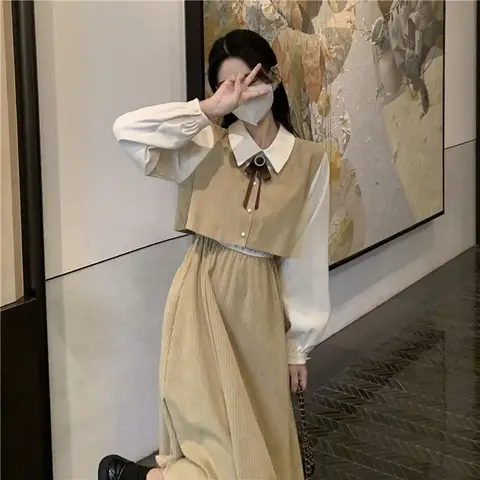 Women's vintage dress in the style of prepue, a French patchwork dress to the middle of the caviar with a long sleeve, everyday cute student ...