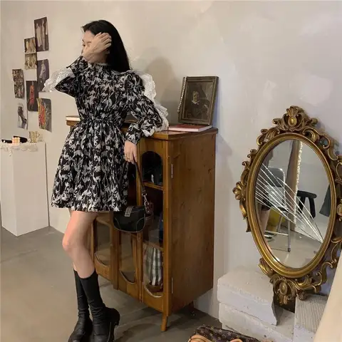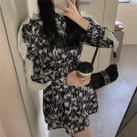 Women's lace dress with a long sleeve, a black vintage tunik dress of a trapezoidal shape with a floral print, in a Korean style, ale ...